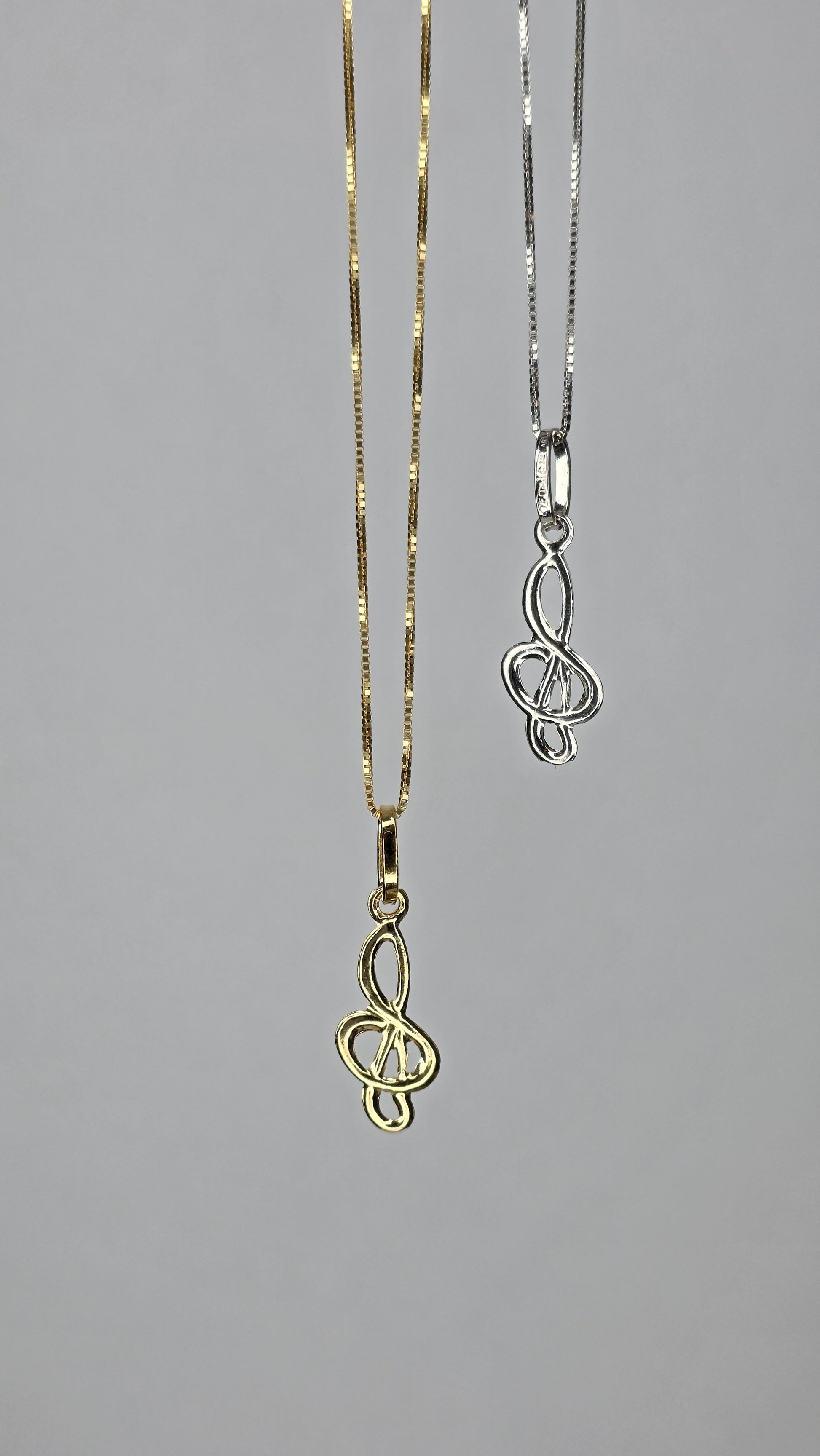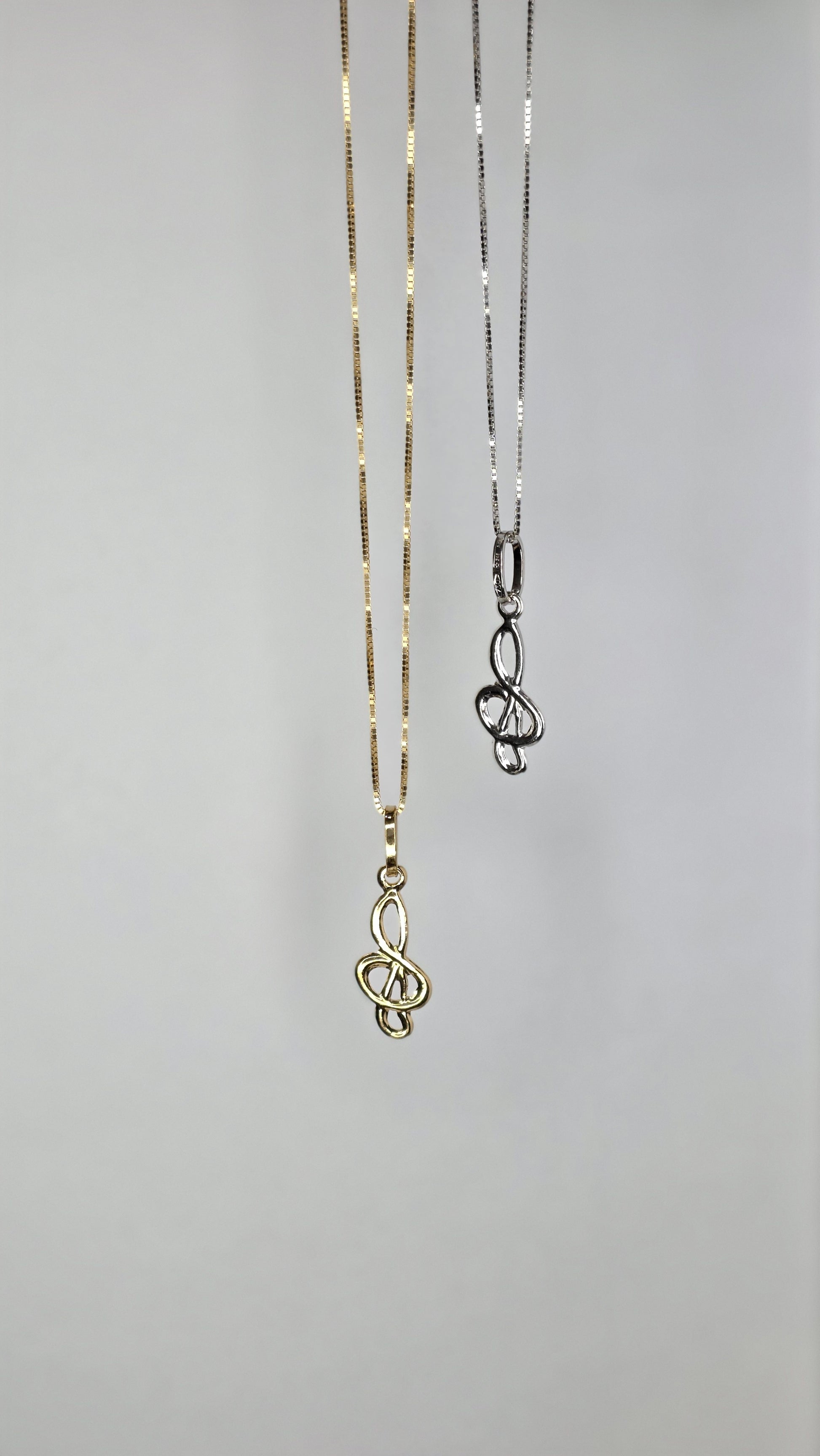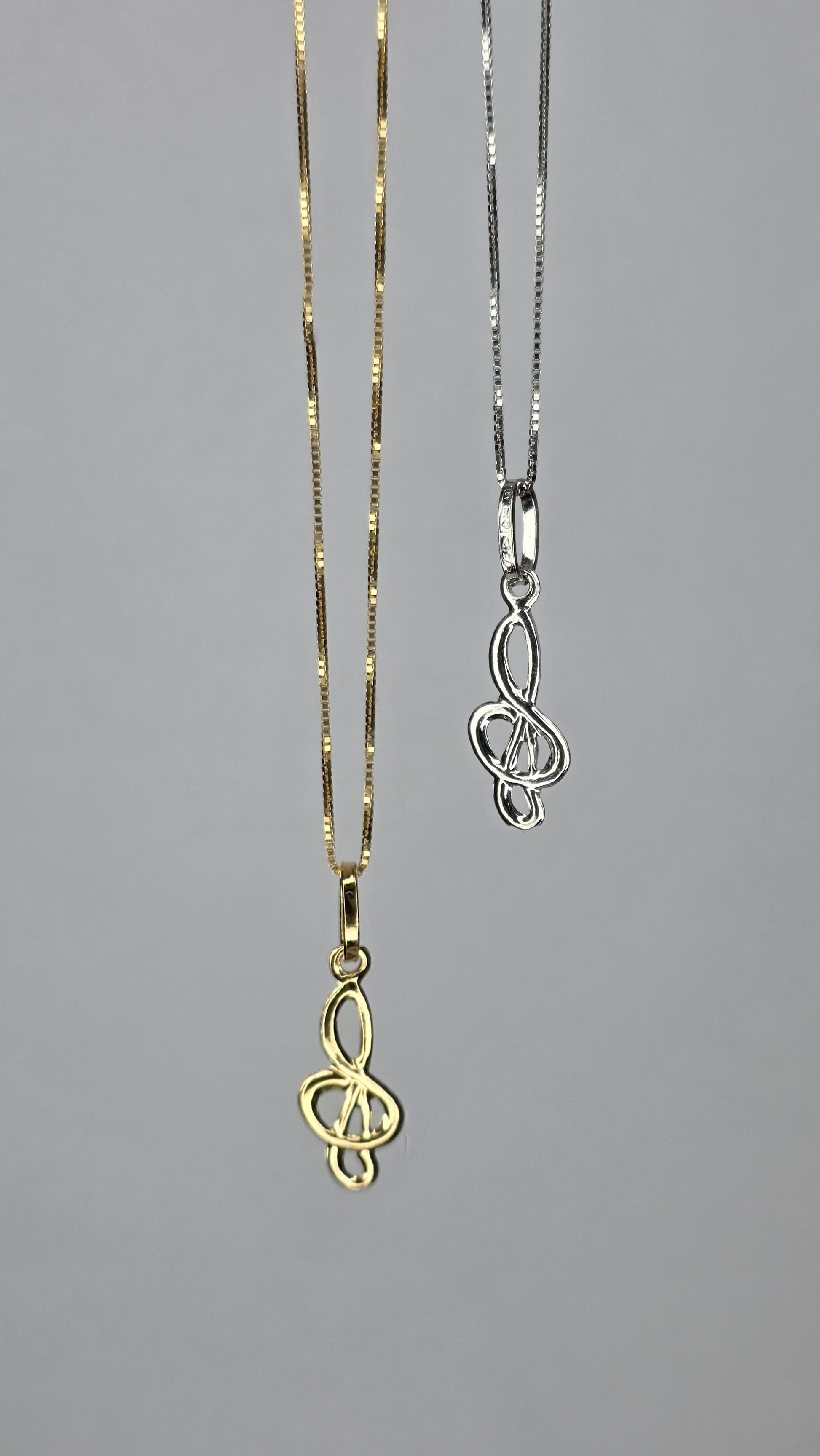 Elegante ciondolo a forma di chiave di violino realizzato interamente in oro 18k, disponibile in due raffinate varianti: oro giallo e oro bianco.