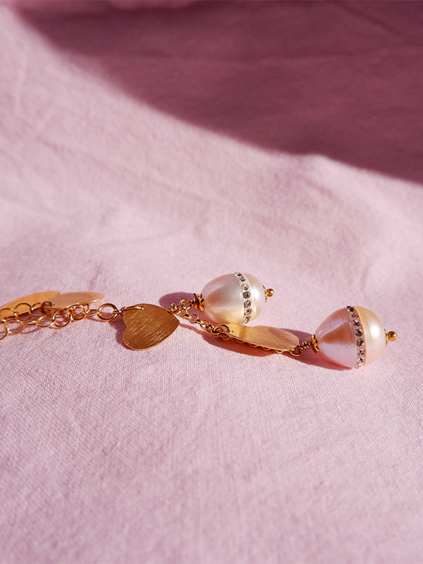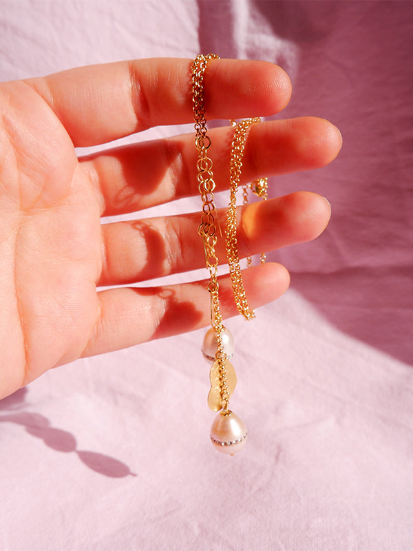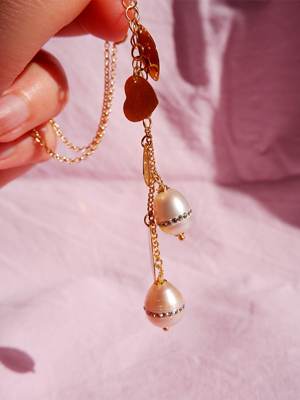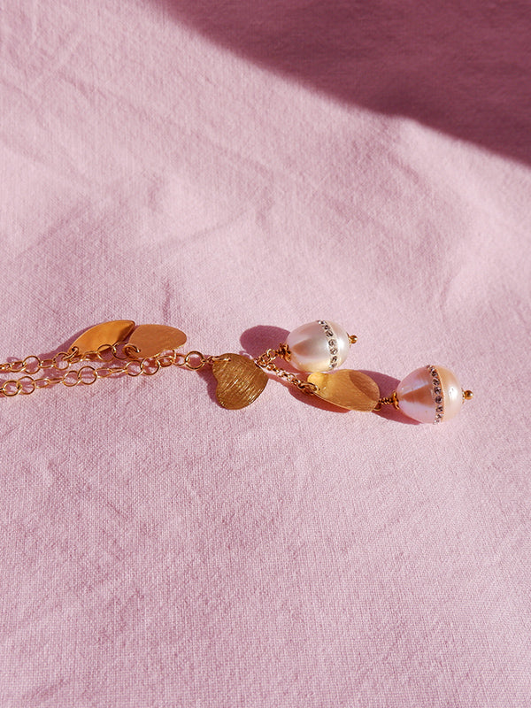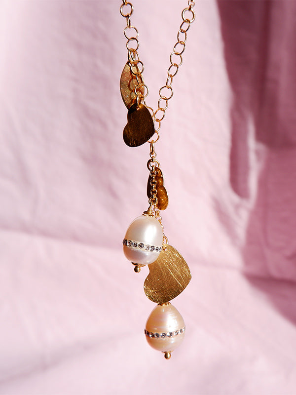 Collana pendente in oro giallo 18k a maglia rolò con applicazioni di piccoli charms in oro giallo: una fogliolina in oro lucido e tre cuoricini in oro graffiato, e due perle, una bianca ed una rosa, con giro di zirconi. La lunghezza del giro è di 45cm, con pratica chiusura a molla, e la lunghezza del pendente è di 5cm.